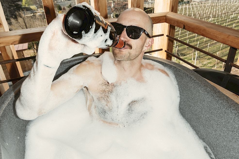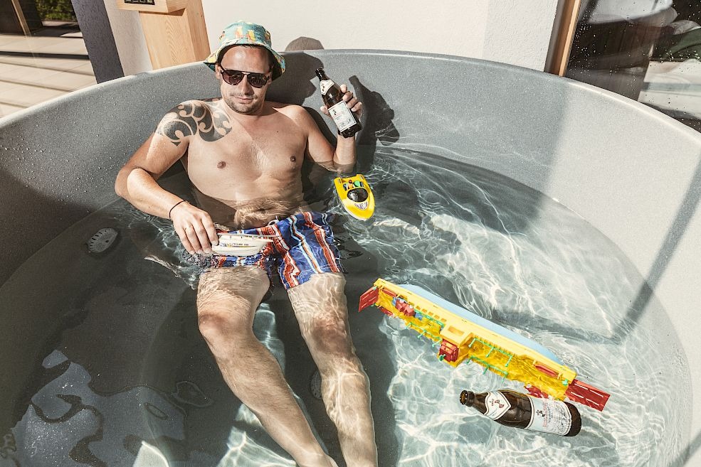 Unser Whirlpool ist so groß, dass selbst der aufgeblasene Onkel Herbert samt seiner Schwimmnudel darin Platz hat.